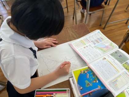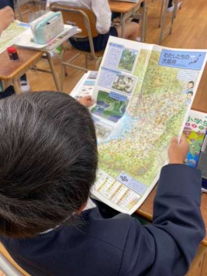 地図を見て大阪府のいろいろな土地使われ方の特色など見つけていきました。自分たちの住む大阪市の特徴などしっかり学んで、自分たちの住む地域のことを知っていきましょう。