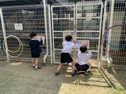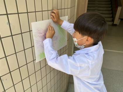 1年生が何やら壁や床でパスを使ってぬりぬりぬり…!