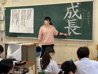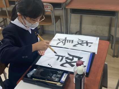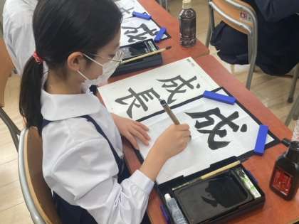 習字で「成長」の文字の練習しています。筆を使って書くのは普段の鉛筆と全然ちがうので扱いも大変です!