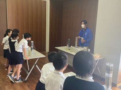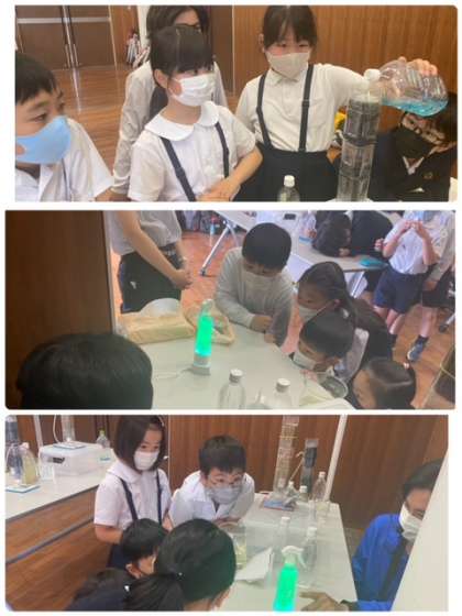 施設内の見学からもどると、実験を行いました。浄水場の中の行程の一部をミニチュア模型で水がどれぐらいきれいになるかを実験しました!