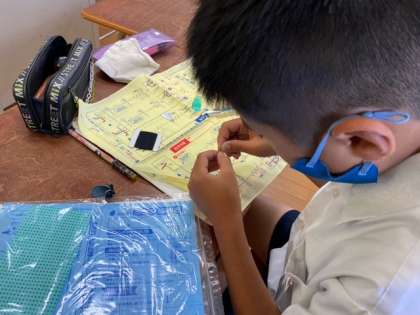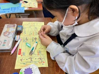 針に糸を通すのも一苦労!さらに玉結びに悪戦苦闘!!なかなか上手くいきません!早くできた人が友だちに教えてあげる姿もみられました。