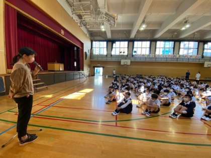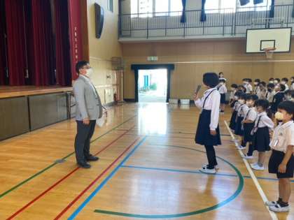 今日は校長先生から運動会についてのお話がありました。運動会のめあてが決まっているけれど、しっかりそのめあてを達成するために言葉だけではなく、どんな行動をするとよいか考えましょうとお話がありました。