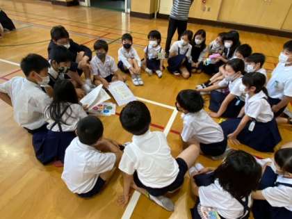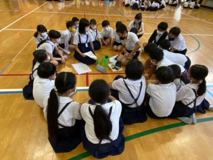 今日の児童朝会は今月の23日に行われる「豊崎わくわくフェスティバル」で、各班が行うのお店の説明や準備物の確認でした。