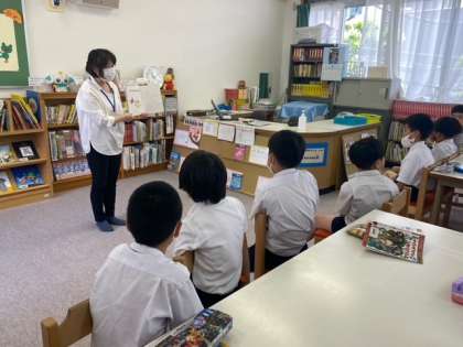みんなが図書室に行った時には読み聞かせもしてくださります。今日は運動会も近いので運動会にちなんだお話を読んでくださりました。みんな真剣にお話を聞いていました。