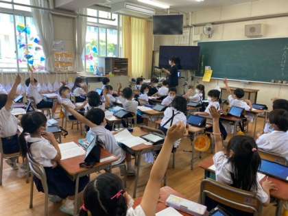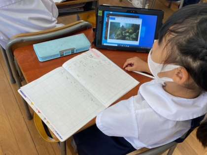国語の「みんなにはなそう」では身の回りで見つけた物の中から紹介する物を決め、相手に聞こえるように、声の大きさを工夫して話していきます。先日タブレットでみんなに紹介したいことを写真で撮影したので、今日は文章をかんがえていきました。