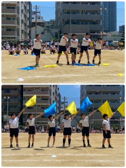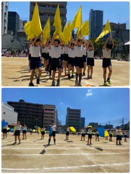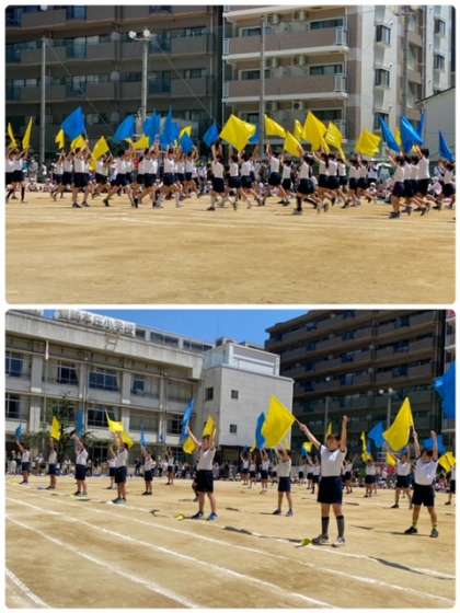 今年度の団体演技はフラッグを使った演技です。風にたなびく2色の旗。空に向かってまっすぐ突き出された約60本の旗。振り下ろすたびに響き渡る一つ一つの音が圧巻でした。今まで繰り返し練習してきた成果が発揮されたとても立派な演技でした。