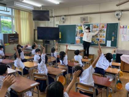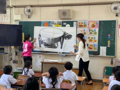 今日は給食調理員さんたちが、普段どれぐらいの食材を使ってどうやって給食を作っているのか教えていただきまして。また毎日208人分もの給食を作っていることを知りとても驚いていました。そして作っているお鍋の大きさにびっくりしていました。