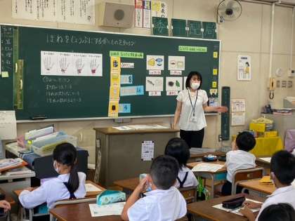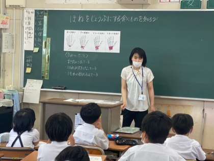 今日は「栄養指導」で「骨をじょうぶにする食べ物」について栄養士の先生に来ていただき教えていただきました。