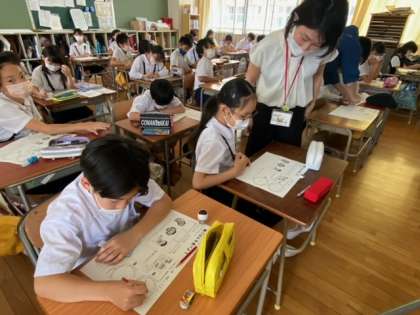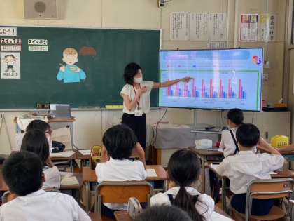栄養士の先生にきていただき、「朝ごはんのはたらき」について教えていただきました。朝ごはんを食べると、脳と体とお腹のスイッチが入りいろいろメリットがある事を教えていただきました。