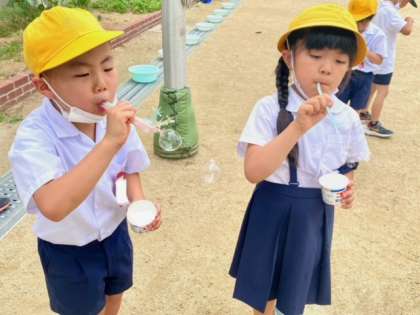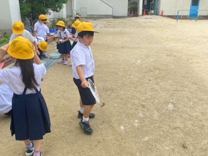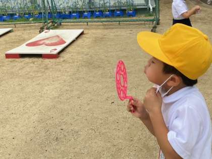 その後は、うちわなどを使ってたくさんしゃぼんだまをとばしていました。大きなしゃぼんだまができるたびに、歓声があがってまいました。