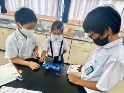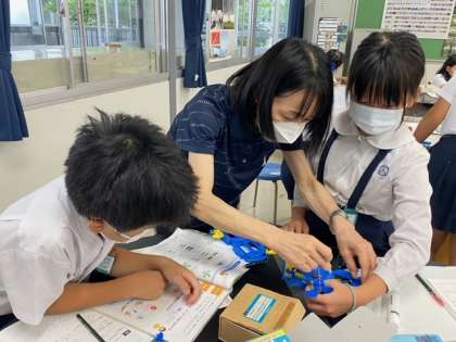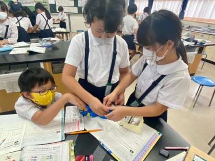 理科の学習ではかん電池とモーターを使って電気で動くおもちゃを作っています。