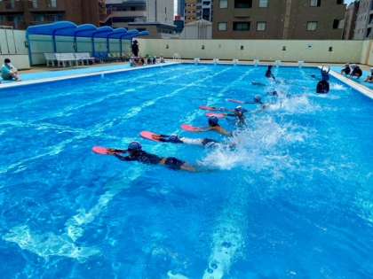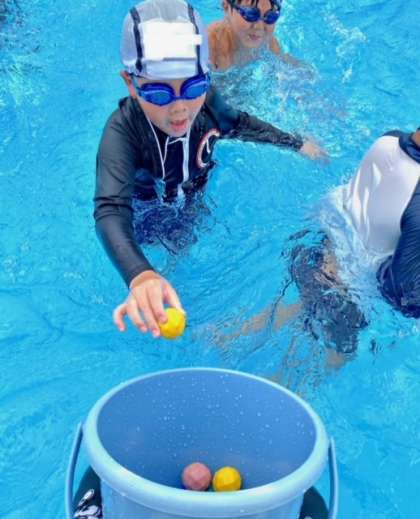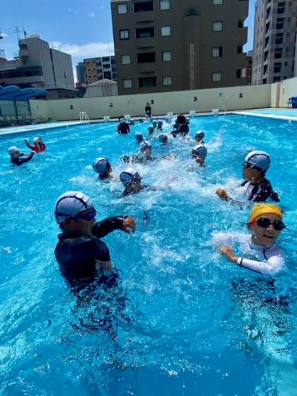 低学年のプールでは水慣れで水のかけあいっこをしたり、逆立ちをしたり、一回転の練習をしたりしました。少し難しい技のほうが夢中になるみたいで、みんな一生懸命練習していました。
