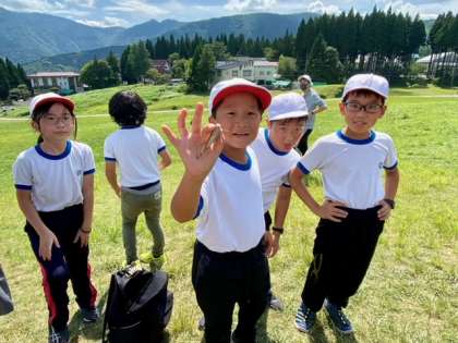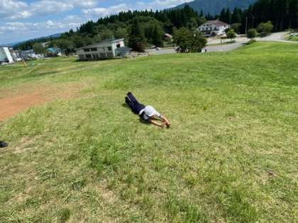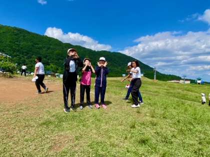近くの高原を散策しました。虫をつかまえたりやまびこをしたり転がったりして自然を満喫しました。