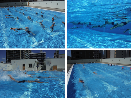 水慣れの後,けのび,バタ足,クロールと泳いだ後,泳力別のコースに分かれての学習がスタート。