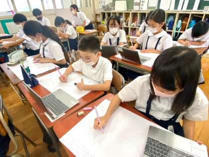 みんな平和を表現するにはどうしたらいいか、あれこれ考えながら下絵を描いていました。タブレットで国旗を調べたり、平和の象徴の鳩を検索したりして下絵を描いていました。