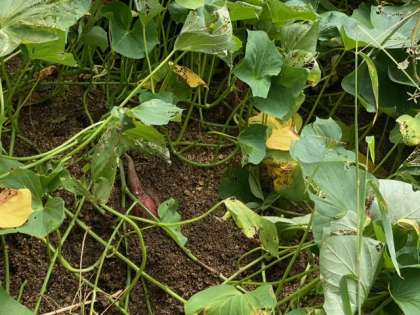 2年の学習園で、すくすくと育っているサツマイモがそろそろ大きくなり始めています。