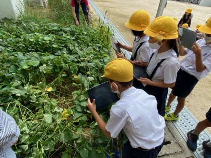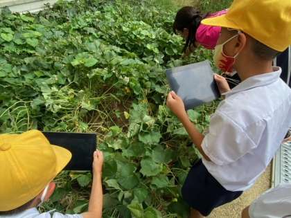 よく観察すると、土の中からサツマイモが見えています。みんなサツマイモの様子をタブレットで撮影し、観察していきました!