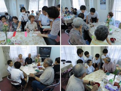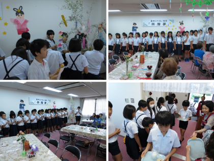 給仕とお客さん役に分担し,お菓子とジュースや,地域の方々に飲み物をお渡ししました。