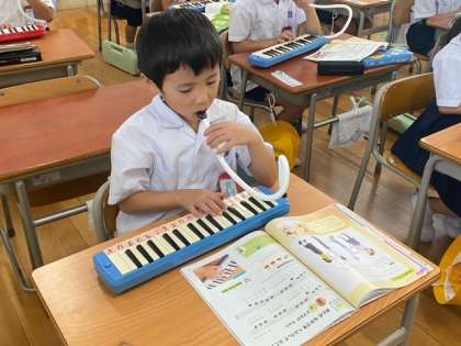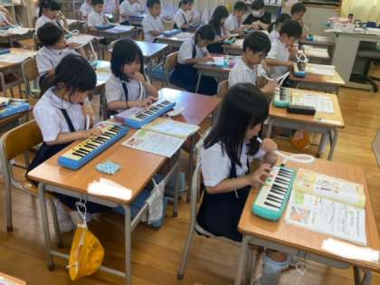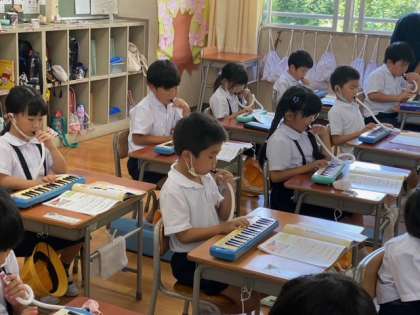 1年生の教室から鍵盤ハーモニカの演奏がきこえてきます。みんなリズムに合わせて「すずめがちゅん」の曲を演奏していました。