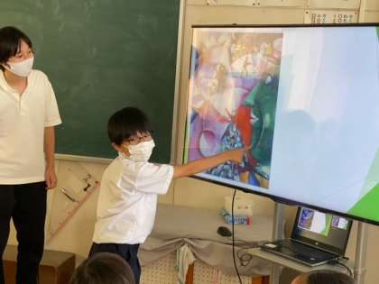シャガールの「私と村」という作品と葛飾北斎の「諸国瀧めぐり」という作品をそれぞれ鑑賞し、2つの作品の似ているところや違うところを見つけていきました。一見、共通点など無さそうですが、