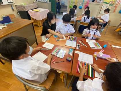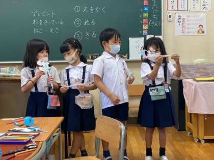 1年生はストローをつかって、動くおもちゃ作りをしました。みんなとても楽しいおもちゃができましたね。最後には出来上がったおもちゃをみんなの前で発表していました。