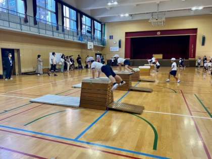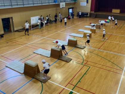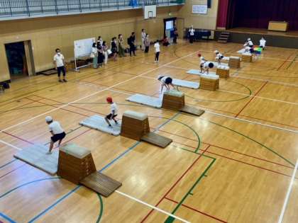 色々な種類のとび箱が用意されていて、自分にあったとび箱の練習を行なっていました。とび箱はコツをつかむとどんどん跳べるようになり、「出来た!」という達成感も感じる事ができます。