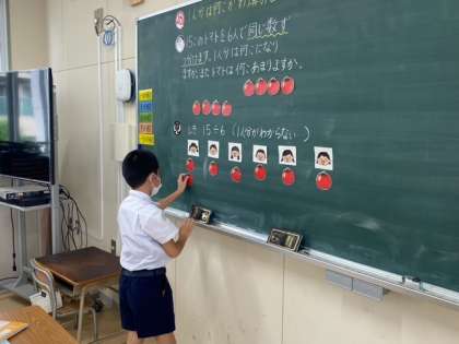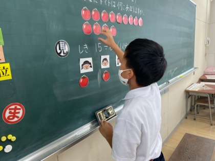 今日は15個のトマトを6人で同じ数ずつわけた時の1人分とあまりを考えていきましま。1人分は2個で3個あまるという答えを求めるには、かけ算の九九を使うと簡単に求められる事を学習しました。