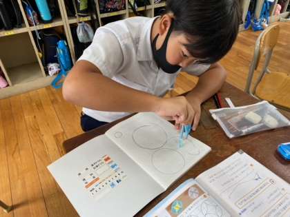 最初はうまく円を描けませんでしたが、何回も練習をしていくうちにコンパスの扱い方が分かってきたようです。どんどん上達していました。