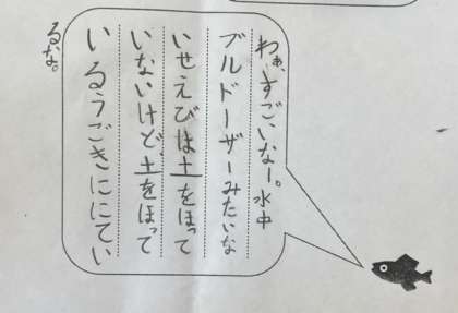 くらげ、いせえび、こんぶ、わかめ、うなぎにいそぎんちゃくなどたくさんの海の生き物とであってスイミーはだんだん元気を取り戻していきます。その時の気持ちをワークシートに記入しました。みんなしっかり自分の考えをかけていました。