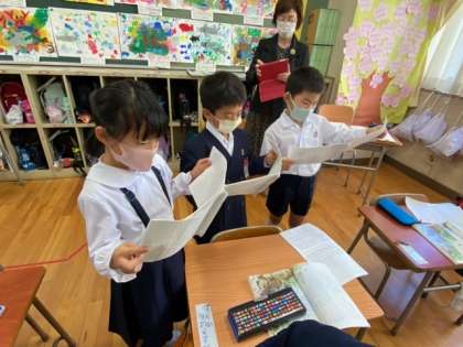 その後、読み取ったことを生かして音読をしていきました。せりふの中に気持ちを込めたり、言葉を付け加えたりして感じたことを表現していきました。みんなとても上手に音読できていて、お互いの良いところもたくさん発表していくことができました。