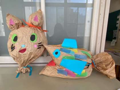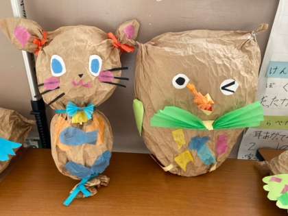 うさぎ、フクロウ、さかな、などさまざまな可愛らしい動物が出来上がり廊下に並んでいます!どの作品も子どもの思いがつまっていて、見ているだけで癒されます!