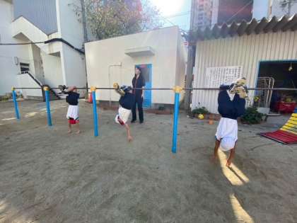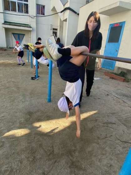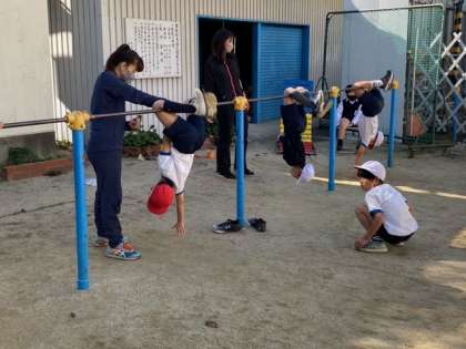 鉄棒に足をひっかけて、両手をはなして地面に両手をついて着地をします。みんな最初は手をはなすのを怖がっていましたが、練習を重ねていくと上手になっていました。手をついて着地できる子も増えてきました。技が成功するまで、何度も繰り返し練習する姿が見られました!