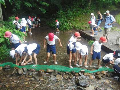 魚つかみです。 まず、水の冷たさに驚き、ニジマスの触感に困り、悪戦苦闘の子どもたちです。天候は曇り空ですが麓からみるとおそらく雲の中だと思われます。