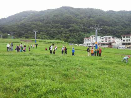 高原散策です。後方に写っている宿舎の左端が我らの宿【ヴィ・ギンレイ】です。