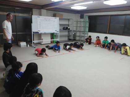 霧雨のため、予定を変更して室内オリンピックをしています。活動班対抗で盛り上がっています。キャンプファイヤーは明日に延期しました。