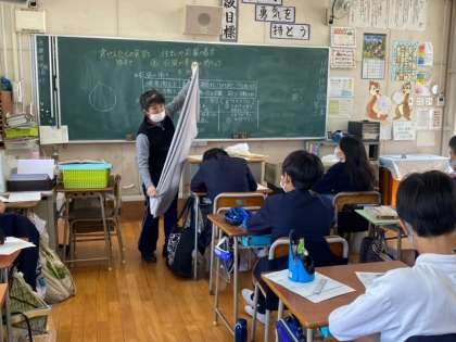家庭科では、快適に過ごすための住まい方や衣服の着方、手入れの仕方について学習を行っています。今日は、衣服の素材の特徴について学習をしていきました。