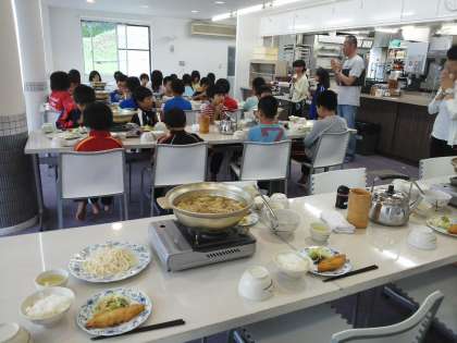 いただきます。今夕のメニューは、鴨すき鍋と白身魚のフライです。しっかり食べて、次のキャンプファイヤーのエネルギーにしましょう。