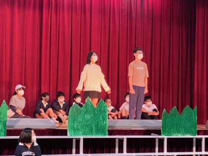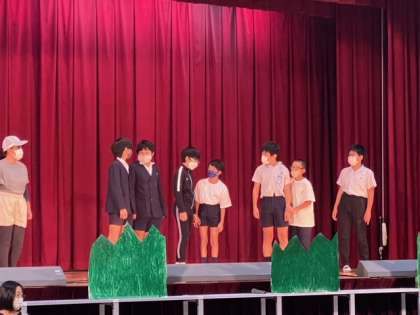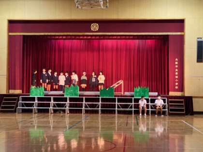 6年生の学習発表会の練習では、本番と同じように衣装をつけたり小道を使ったりしながら練習しています。衣装を着けたりするとさらに意欲もわいてきますね!