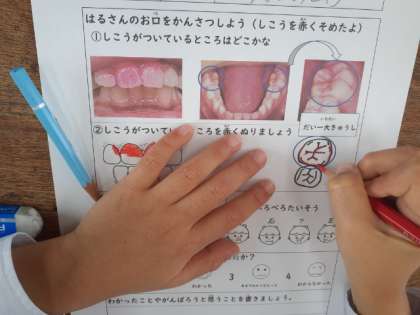 歯垢(しこう)がたまると、むし歯になりやすいことを学習し、歯垢がたまりやすい場所や、歯の正しい磨き方を教えていただきました。