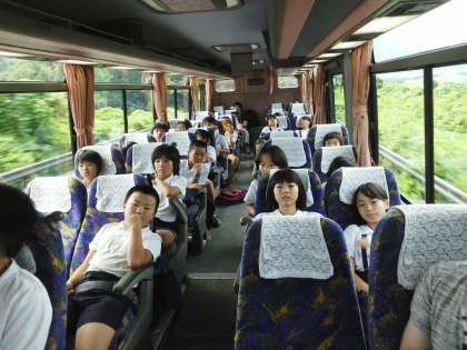 トイレ休憩の道の駅「まほろば」を出ました。子どもたちはリクライニング席で映画鑑賞中です。上映中『チャーリーとチョコレート戦争』