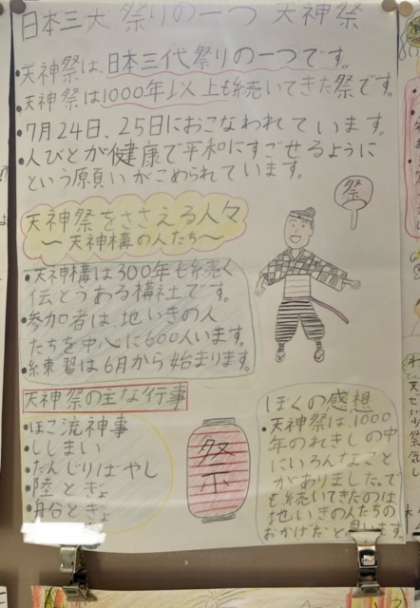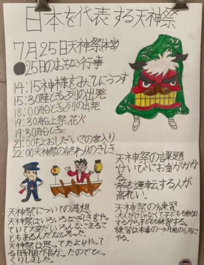 社会科では郷土の伝統として残したいものとして「天神祭」の学習を行いました。
