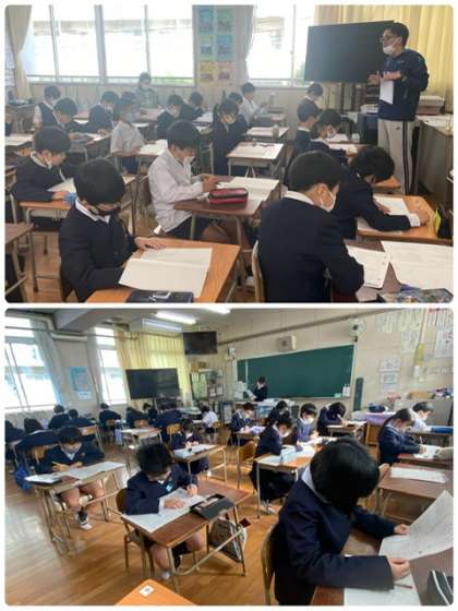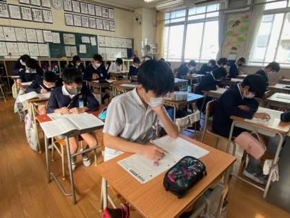 3年生は、質問用紙と解答用紙に分かれた問題をとくテストは初めてになります。担任先生の説明を聞いてテストに取り組んでいました。また、どの学年も一生懸命問題を解いて頑張っていました。