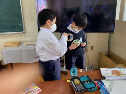 身の回りにある円の形をしたものから円周を測り、半径も測ってその関係を調べていきました。いわゆる円周率についての学習です。実際に測って調べることで円周率もよくわかりますね!