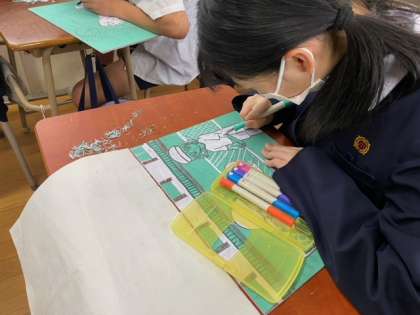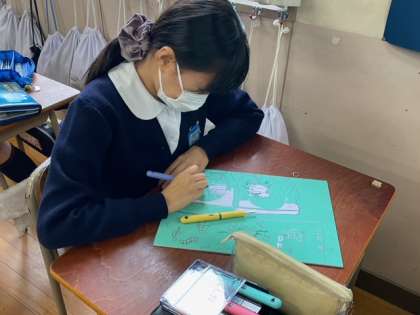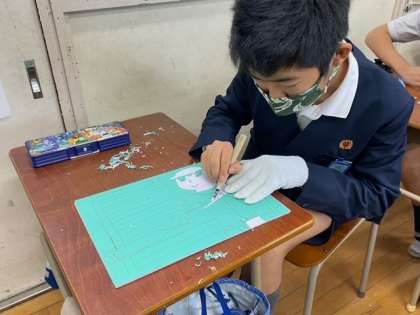 図画工作では版画を彫りすすめています。テーマは「6年の思いで」です。