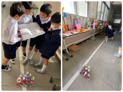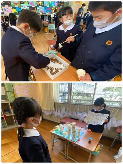 今までの生活科の授業で、木のみをつかったおもちゃを作ってきたので、今日はそのおもちゃで遊びました。お店屋さんとお客さんにそれぞれわかれ遊びました。