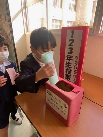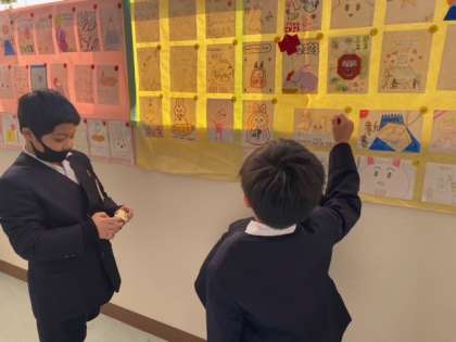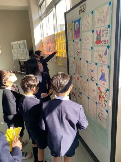 今年も年賀状コンクールが始まりました!今年は新しくなった職員室前に作品を貼りだしています。投票するのが今日からで、さっそく多くの児童が投票をしていました。