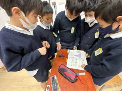 今日の算数では「二等辺三角形」と「正三角形」の角の特徴について学習していきました。それぞれの特徴をおさえた後、同じ形の三角定規をあわせてできる形について調べていきました。