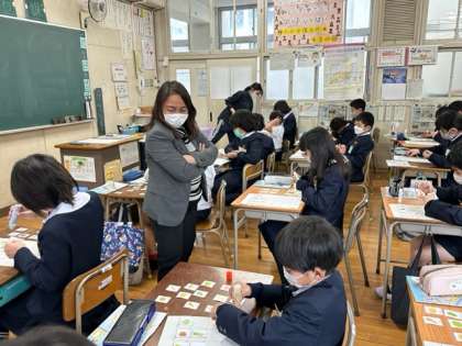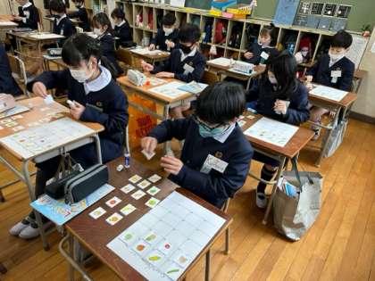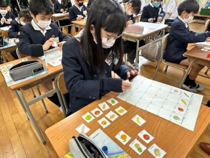 外国語の授業では果物や野菜の単語の練習をしています。先生が言う食べ物を選んでワークシートにカードを貼っていました。みんな先生の言葉を聞いてカードを選んでいました。しっかり単語を覚えているようで、みんなスムーズにカードを選んでいました!