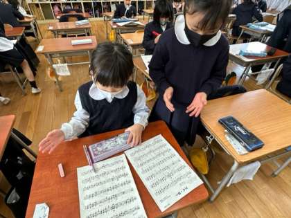 それぞれのパートに分かれて練習を行っています。友だちと一緒に手でリズムうちの練習をしたり、鍵盤ハーモニカの練習をしたり、ピアノ練習をしたりと、個々に個人練習に取り組んでいました。