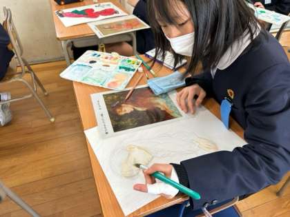 みんな見本を見ながら一生懸命模写をしています。でも、よく見ると一部だけリメイクで絵画とちがうところがあります。それを探すのも楽しいですね♪